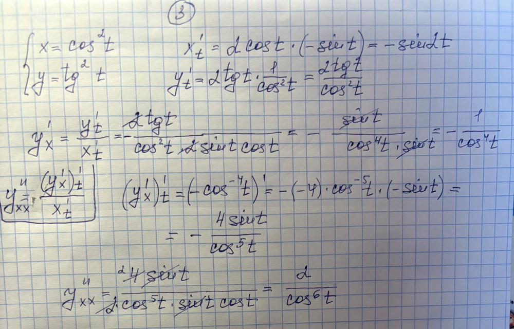 [m]\Big ( \frac{dy}{dx} \Big )'_{t} = (-\frac{1}{\cos^4 t})'_{t} = (-\cos^{-4} t)'_{t} = -(-4)\cos^{-5} t (-\sin t) = -\frac{4\sin t}{\cos^5 t}[/m]