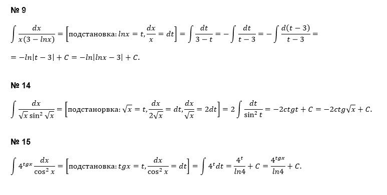 Помогите, пожалуйста, с решением итеграллов из I раздела под номерами: 9),14),15),17),18)