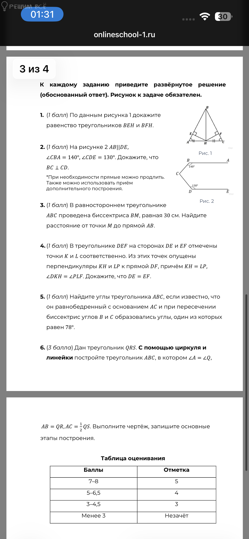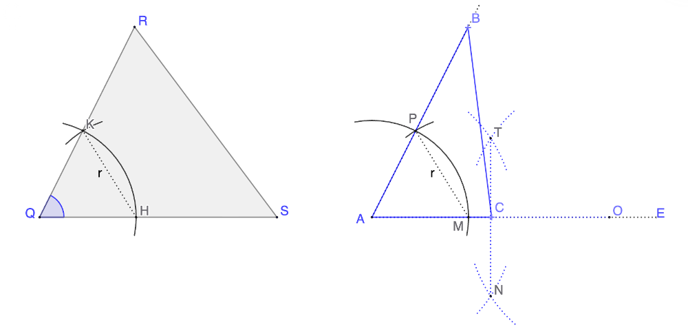 6. (3 балла) Дан треугольник QRS. С помощью циркуля и линейки постройте треугольник ABC, в котором ∠A = ∠Q, AB = QR, AC = 1/2 QS. Выполните чертёж, запишите основные этапы построения.