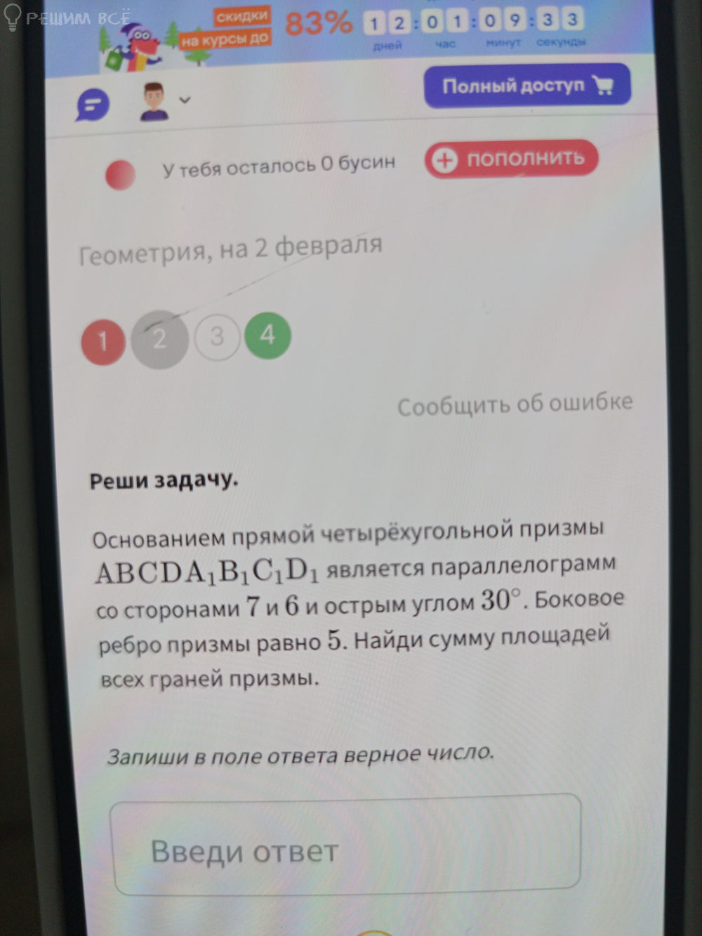 • основания – параллелограмм со сторонами a = 7 и b = 6, острый угол α = 30°;