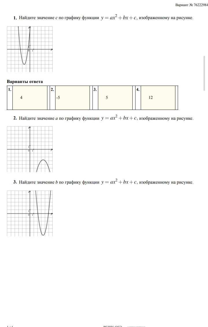 1) c = –5; 2) a = –1; 3) b = –2.