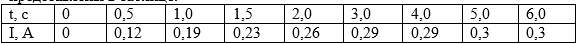 Катушка индуктивности на железном сердечнике подключена к источнику тока с пренебрежимо малым внутренним сопротивлением через резистор R = 40 Ом (см. рисунок). В момент t = 0 ключ К замыкают. Значения силы тока в цепи, измеренные в последовательные моменты времени с точностью ±0,01 А, представлены в таблице.