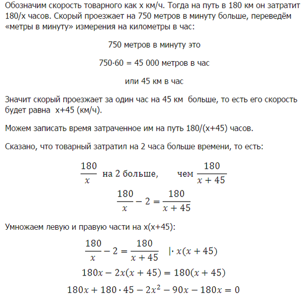 Товарный поезд каждую минуту проезжает на 750 метров меньше, чем скорый, и на путь в 180 км тратит времени на 2 часа больше, чем скорый. Найдите скорость товарного поезда. Ответ дайте в км/ч.