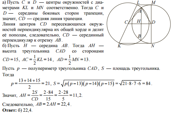 Дана трапеция KLMN с основаниями KN и LM. Окружности, построенные на боковых сторонах KL и MN как на диаметрах, пересекаются в точках A и B. а) Докажите, что средняя линия трапеции лежит на серединном перпендикуляре к отрезку AB. б) Найдите AB, если известно, что боковые стороны трапеции равны 26 и 28, а средняя линия трапеции равна 15.
