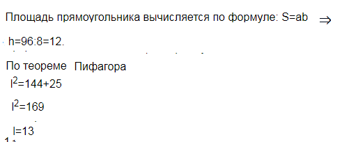 Для покраски прямоугольной стены дома площадью 96 м^2 и длиной 8 м было принято решение использовать лестницу, так как в 5 м от неё находился бордюр, в который её можно было упереть (см. рис. 187). Какой длины (в метрах) необходимо приобрести лестницу, чтобы её верхний край совпал с верхним краем стены?