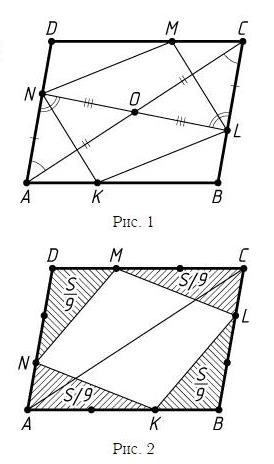 Значит,S(KLMN) = S − 4*1/9*S = 5/9S.