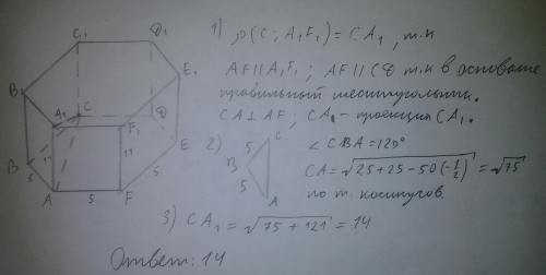 В правильной шестиугольник призме ABCDEFA1B1C1D1E1F1, стороны основания которой равны 5, а боковые ребра равны 11, найдите расстояние от точки C до прямой A1F1.