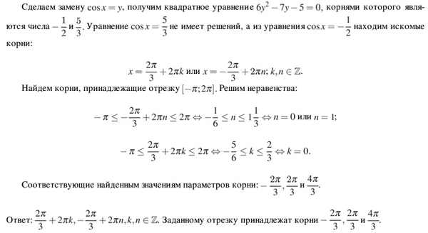 Решите уравнение 6cos^2x-7cosx-5=0 . Укажите его корни, принадлежащиеотрезку [-Pi;2Pi]