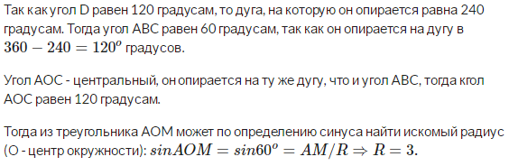 Четырехугольник ABCD вписан в окружность. Найдите радиус окружности, если AC=3sqrt(3), а угол D равен 120 градусов