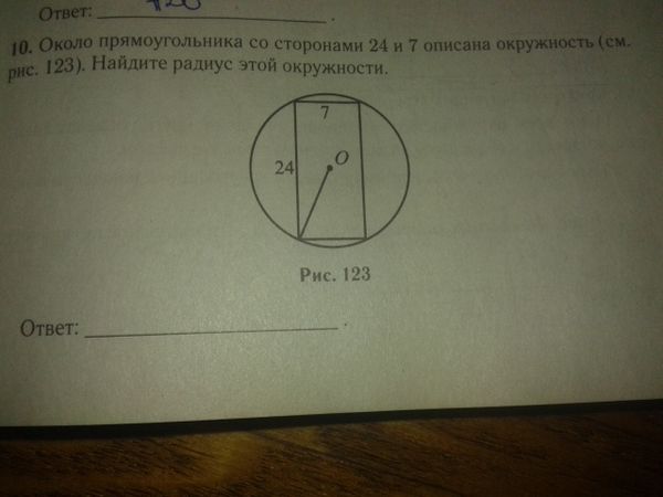 Около прямоугольника со сторонами 24 и 7 описана окружность. Найдите радиус этой окружности