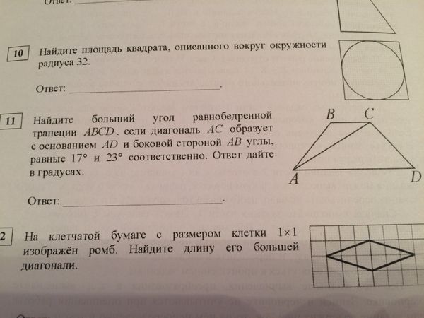 Найдите больший угол равнобедренной трапеции ABCD, если диагональ AC образует с основанием AD и боковой стороной AB углы, равные 17° и 23° соответственно. Ответ дайте в градусах.