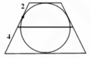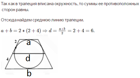 Трапеция равнобедренная, раз в трапецию вписана окружность, то суммы ее противолежащих сторон равны, то есть сумма двух оснований (a+b) равна сумме двух боковых сторон (2+4)+(2+4) или проще записать 2*(2+4), отсюда и имеем равенство которое вызвала у вас вопрос