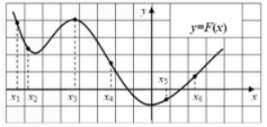 На рисунке приведен график y=F(x) одной из первообразных функции f (x). На графике отмечены шесть точек с абсциссами x1, x2, ..., x6. В скольких из этих точек функция y=f(x) принимает отрицательные значения?