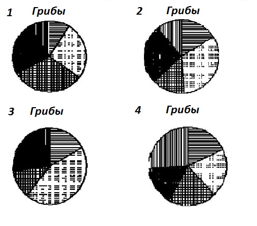 Какая из следующих круговых диаграмм показывает распределение грибов в лесу, если белых грибов всего 16%, мухоморов— 33%, лисичек— 14%, сыроежек— 26% и других грибов — 11%?