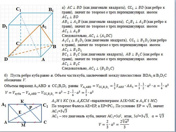 Б) Найдите объем части куба, заключенной между плоскостями BDA1 и В1D1С, если известно, что отрезок диагонали AC1, заключенный между этими плоскостями, имеет длину sqrt(3)