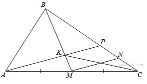 Проведем прямую MNǁAP, KPǁMN => KP-средняя линия => PN=CN. Рассмотрим треугольники ВКР и ВМN: угол МВС - общий, углы ВКР и ВМN равны как соответственные углы при параллельных прямых, откуда: ВМ/ВК=ВN/BP => (BK+KM)/BK=(BP+PN)/BP => 1+KM/BK=1+(BP+PN)/BP => KM/BK=PN/BP=1/4. Аналогично рассмотренным выше случаям S BKP/S KPC=BP/PC=BP/2PN=2. Следовательно, S BKC=3S KPC. S BKC=2/5S => 3S KPC=2/5S => S KPC=2/15S.