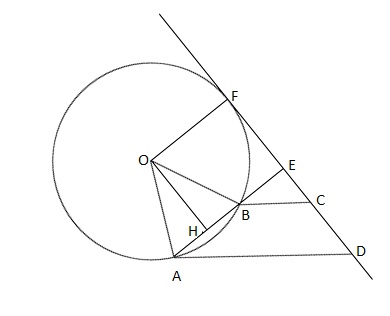 Пусть окружность касается прямой CD в точке F, причём точка F может лежать или на стороне или на её продолжении. Отрезок OF перпендикулярен прямой CD как радиус проведённый в точку касания, OA, OB и OF — радиусы.