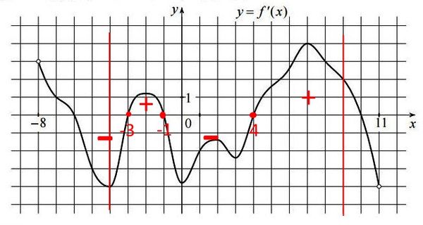 На рисунке изображён график функции y=f'(x) — производной функции f(x), определённой на интервале (-8; 11). Найдите количество точек экстремума функции f(x), принадлежащих отрезку [-4; 9].