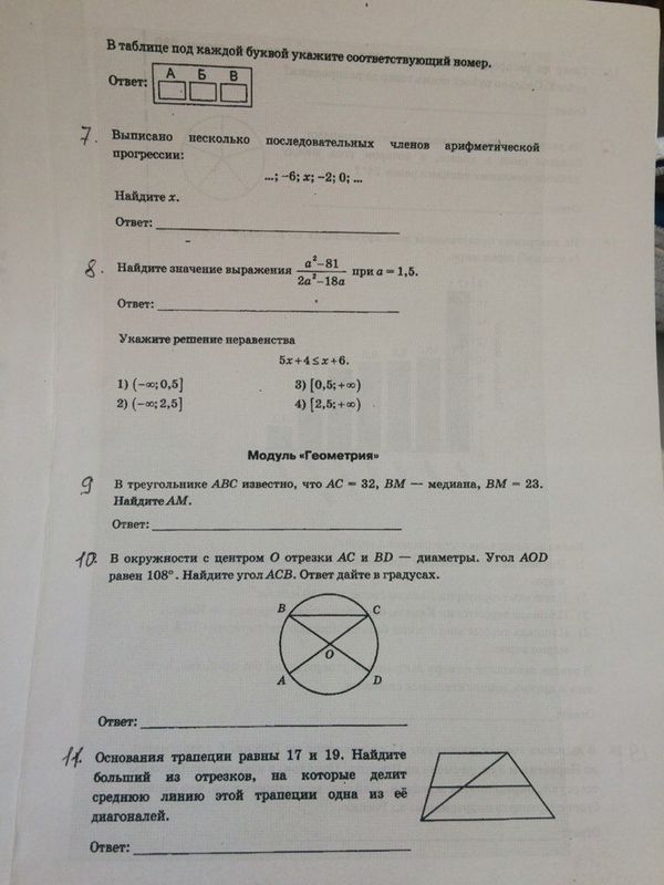 10) В окружности с центром О отрезки AC и BD - диаметры. Угол AOD равен 108 градусов. Найдите угол ACB. Ответ дайте в градусах. 11) Основания трапеции равны 17 и 19. Найдите больший из отрезков, на которые делит среднюю линию этой трапеции одна из ее диагоналей
