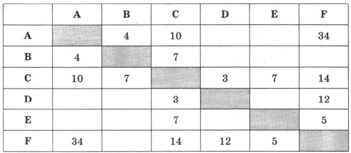Между населёнными пунктами А, В, С, D, Е, F построены дороги, протяжённость которых приведена в таблице. (Отсутствие числа в таблице означает, что прямой дороги между пунктами нет.)