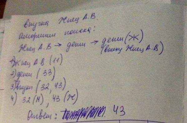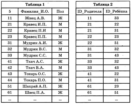 Ниже представлены две таблицы из базы данных. Каждая строка таблицы 2 содержит информацию о ребёнке и об одном из его родителей. Информация представлена значением поля ID в соответствующей строке таблицы 1. Определите на основании приведённых данных ID внучки Жнец А.В.