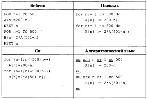 Значения элементов двух массивов — А и В — с индексами от 1 до 500 задаются с помощью следующего фрагмента программы. Сколько элементов массива В будут иметь положительные значения после выполнения фрагмента программы?