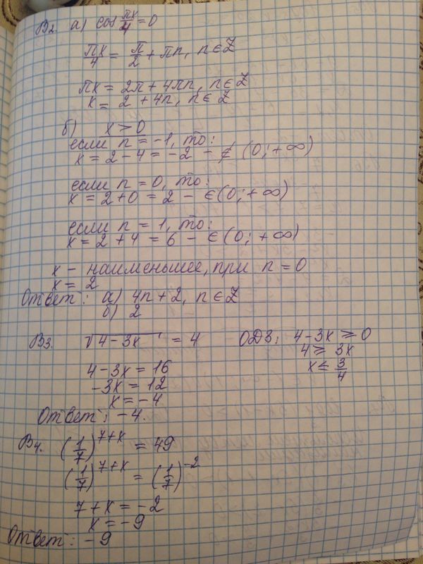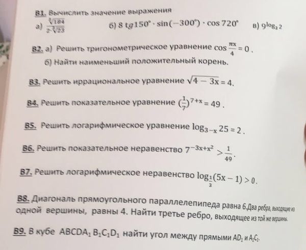 В2) cosПx/4=0 В3) sqrt(4-3x)=4 В4) (1/7)^(7+x) = 49 В5) log(3-x)25 = 2 В6) 7^(-3x+x^2) > 1/49