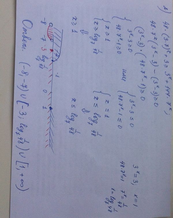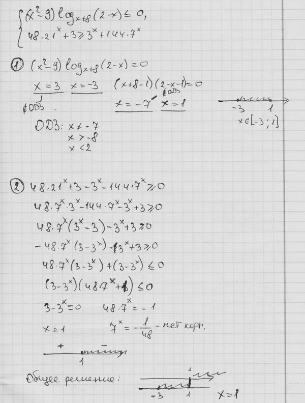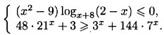 Решить систему неравенств system{(x^2-9)log(x+8)(2-x) меньше или равно 0; 48*21^x + 3 больше или равно 3^x + 144*7^x}