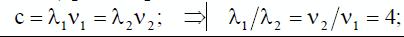 Мужской голос баритон занимает частотный интервал от ?1 = 100 Гц до ?2 = 400 Гц. Чему равно отношение длин волн соответствующих границам этого интервала?