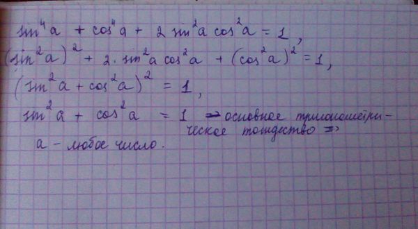 Решить уравнение sin^4a+cos^4a+2sin^2acos^2a=1