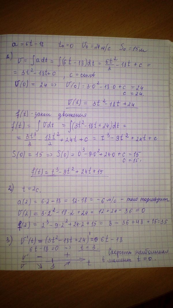 Точка движется прямолинейно с ускорением a=6t-18. В момент времени t0=0 начальная скорость U0=24 м/с, расстояние от начала отсчета S0=15 м.