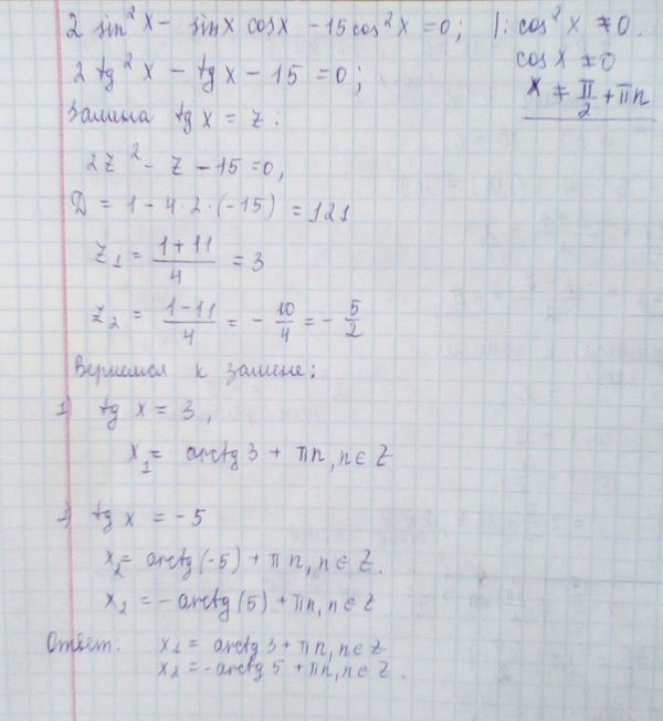 Решите уравнение: 2sin^2x-sinxcosx-15cos^2x = 0