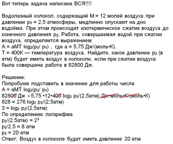 Водолазный колокол, содержащий v = 12 молей воздуха при давлении p1 = 2,5 атмосферы, медленно опускают на дно водоёма. При этом происходит изотермическое сжатие воздуха до конечного давления р2. Работа, совершаемая водой при сжатии воздуха, определяется выражением Вариант 12 — постоянная Т = 400 К — температура воздуха. Найдите, какое давление р2 (в атм) будет иметь воздух в колоколе, если при сжатии воздуха была совершена работа в 82800 Дж.