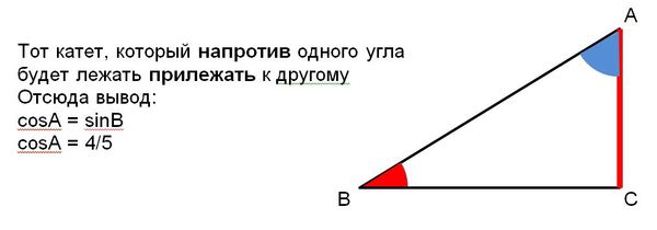 В прямоугольном треугольнике ABC угол C=90°, найдите значение косинуса угла A,если синус угла B равен 4/5.
