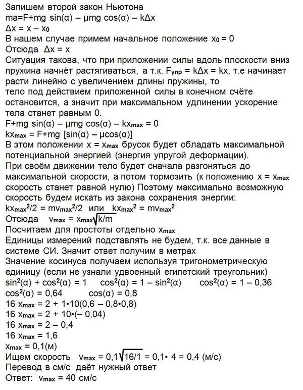 Брусок массой 1 кг лежит на наклонной плоскости образующей с горизонтом угол sin(альфа)=0,6. Брусок соединён с вершиной наклонной плоскости недеформированной пружиной жесткостью 16 н/м. Коэффицент трения бруска о плоскость 0,8. на брусок начинает действовать постоянная сила 2 н, направленная вниз вдоль плоскости. найти максимальную скорость в в см/с бруска. g=10. ОТВЕТ ДОЛЖЕН БЫТЬ 40
