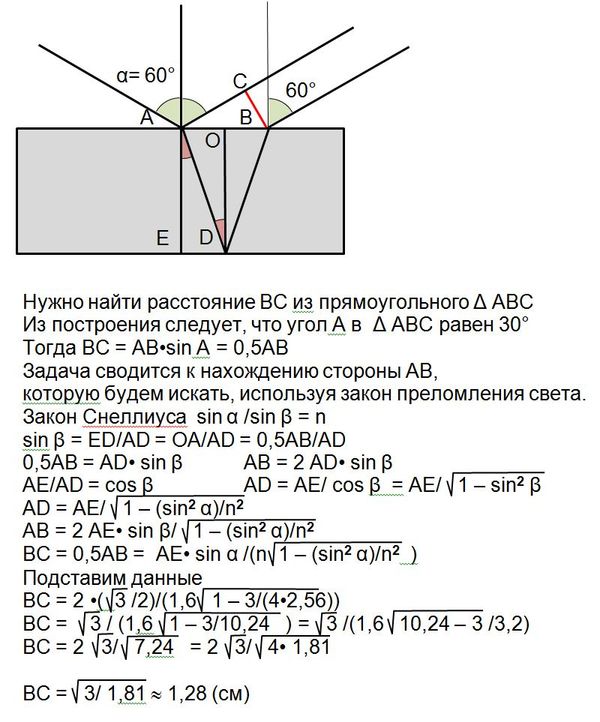 Луч света падает под углом 60 градусов на поверхность стеклянной плоскопаралельной пластины толщиной 2 см. определить расстояние между лучами, отраженными от верхней и нежней поверхности пластинки,показатель преломления которой 1,6