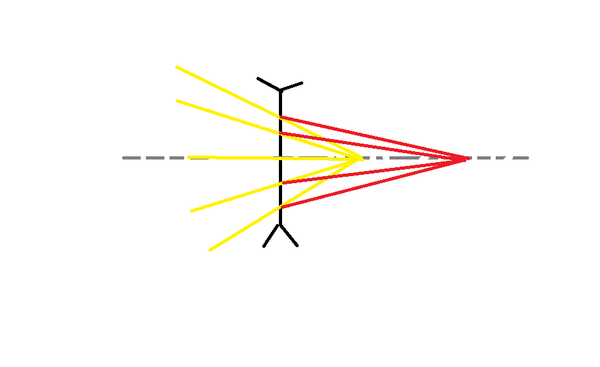 пусть лучи идут слева от линзы, тогда сошлись бы они справа от линзы на 15 см, а из-за рассеивания они сошлись на 60 см справа от линзы. Там где сходятся желтые лучи образуется мнимый предмет. d=15 cм. в формуле тонкой линзы мы пишем, - перед d минус. f=60 см. 1/F=-1/d+1/f откуда 1/F=d-f/d*f следовательно F=d*f/d-f=20 см. (если что-то непонятно пишите в лс)