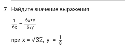 Найдите значение выражения 1/6x - (6x+y)/(6xy) при x=sqrt(32), y=1/8
