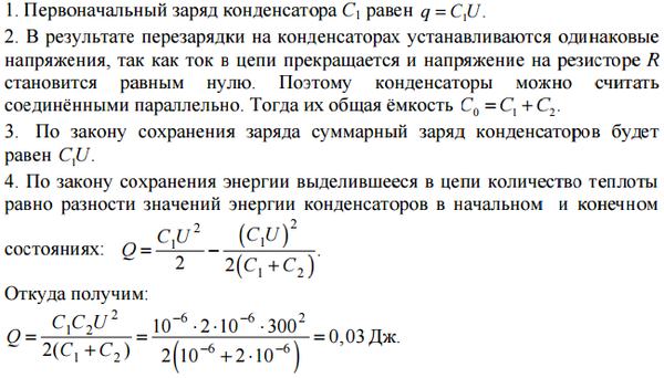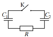 Конденсатор С1 = 1 мкФ заряжен до напряжения U = 300 В и включён в последовательную цепь из резистора R = 300 Ом, незаряженного конденсатора С2 = 2 мкФ и разомкнутого ключа К (см. рисунок). Какое количество теплоты выделится в цепи после замыкания ключа, пока ток в цепи не прекратится?