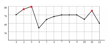 На графике точками отмечена максимальная цена (в рублях) одной акции металлургического комбината в течение каждого из 12 месяцев 2007-го года. Для наглядности точки соединены отрезками. Определите, сколько месяцев в 2007-м году максимальная цена одной акции этой компании превышала 70 руб.