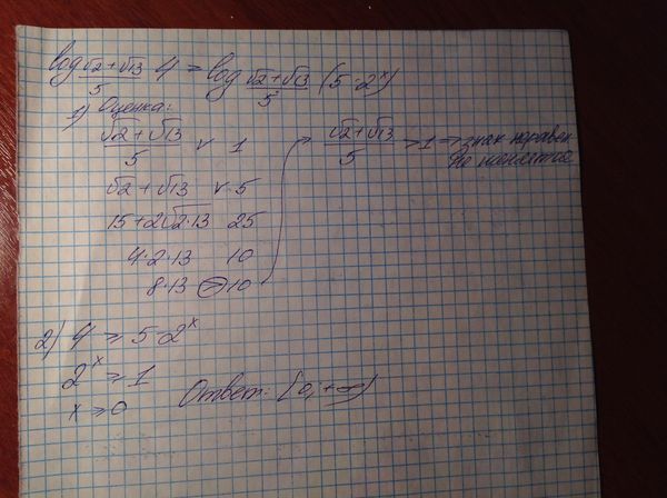 Решить неравенство log((sqrt(2)+sqrt(13))/5) 4 больше или равно log((sqrt(2)+sqrt(13))/5) (5−2^x)