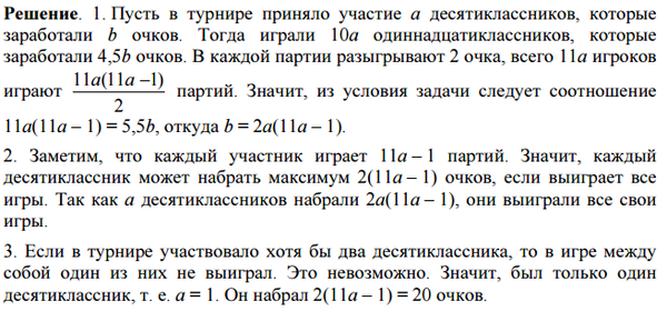 В турнире по шашкам участвовали ученики 10 и 11 классов. Каждый сыграл с каждым один раз. За победу участник получал 2 очка, за ничью — 1 очко, за проигрыш — 0 очков. Одиннадцатиклассников было в 10 раз больше, чем десятиклассников, и они вместе набрали в 4,5 раза больше очков, нежели все десятиклассники. Сколько очков набрал самый успешный десятиклассник?