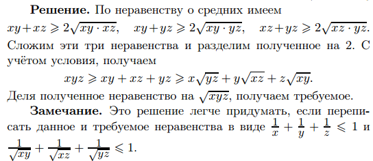 Положительные числа x, y и z удовлетворяют условию xyz больше или равно xy+yz+zx. Докажите неравенство sqrt(xyz) больше или равно sqrt(x)+sqrt(y)+sqrt(z) (А. Храбров)